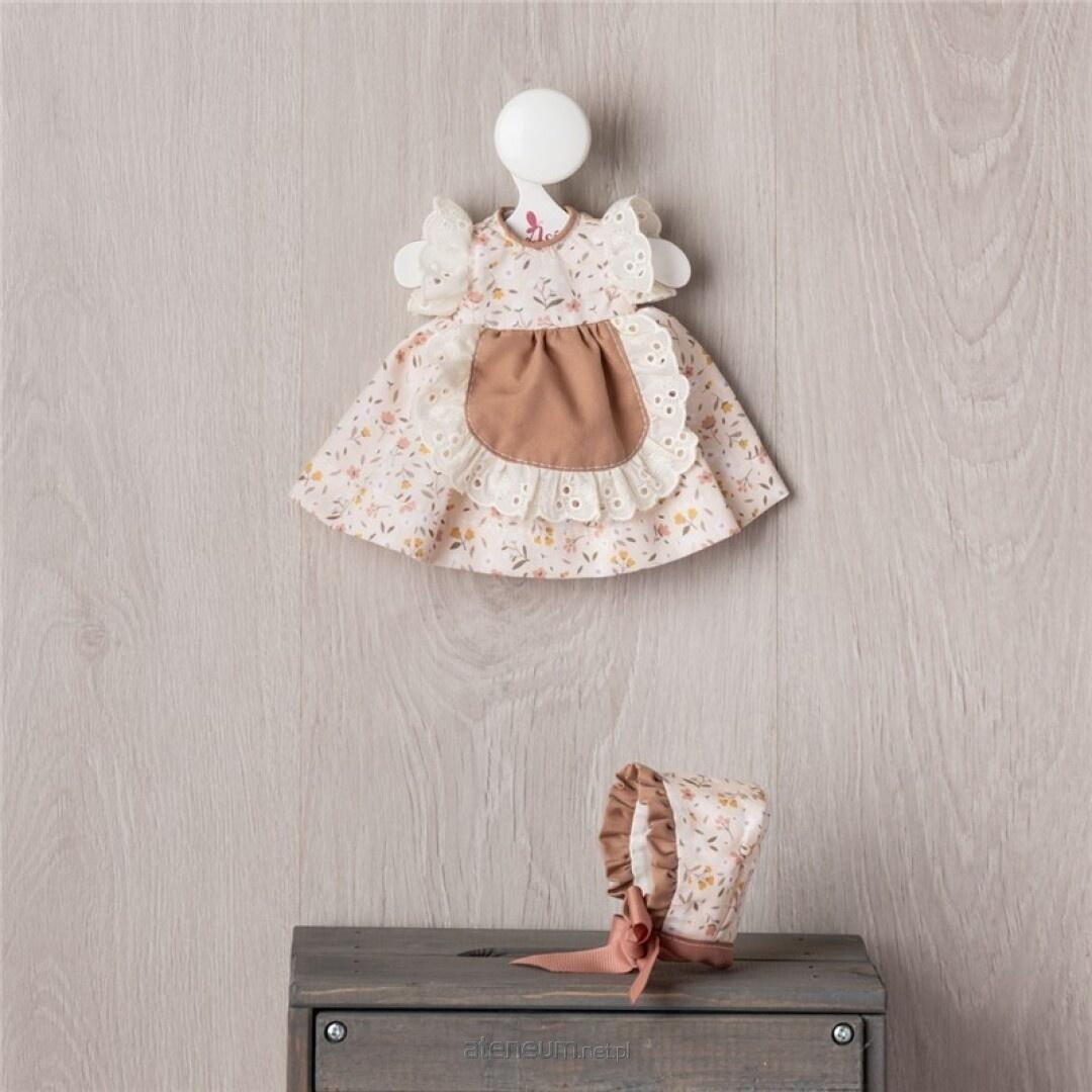 Każdą zabawę lalkami uatrakcyjnia wysokiej jakości, ręcznie szyty, unikalny outfit. Jasnobeżową bawełnianą sukienkę w delikatne kwiatuszki wykończono gipiurową falbanką oraz ozdobiono słodkim fartuszkiem. Całość dopełnia uroczy czepek wiązany lśniącą satynową wstążeczką. Strój perfekcyjnie leży na 30-cm. lalkach "przyjaciółkach" z serii ASI Celia. Uatrakcyjnia zabawę w projektantkę mody.