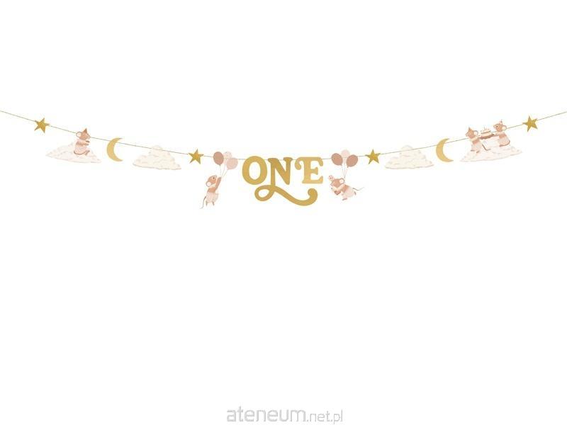 Baner One Myszki w kolorze beżowym ze złotymi elementami o długości 300 cm. Produkt gotowy do użycia po wyjęciu z opakowania. Papierowy baner przeszyty złotym sznurkiem.