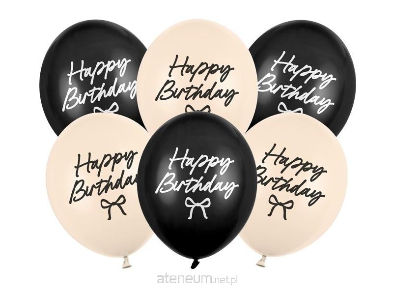 Balony Strong Happy Birthday Kokardki. Zestaw zawiera 6 balonów: 3 Pastel Black z nadrukiem i 3 Pastel Nude z nadrukiem. Średnica ok. 30 cm.(1 op. / 6 szt.)
