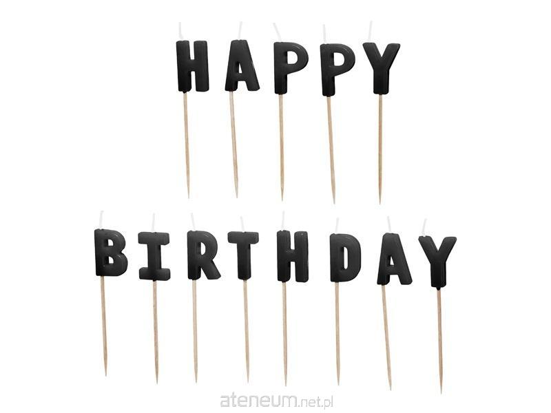 Świeczki urodzinowe Happy Birthday w kolorze czarnym z drewnianymi podstawkami, wysokość ok. 2.5 cm.(1 op. / 13 szt.)