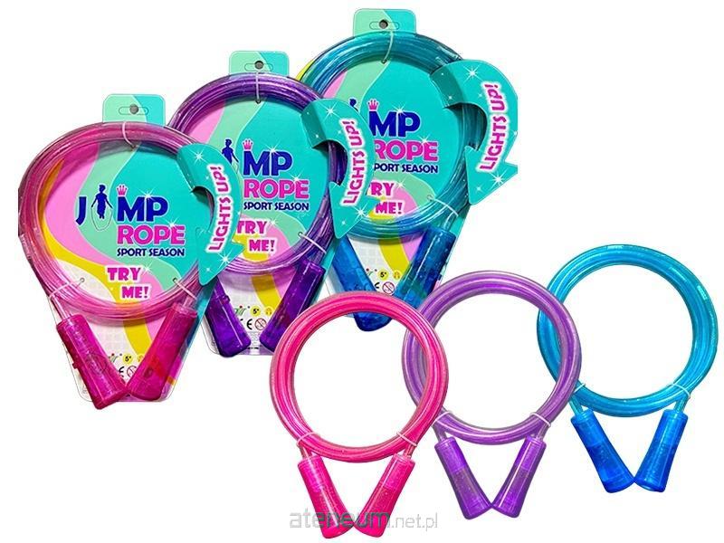 Opis: 3 wzory; dł. skakanki: 2,2 m; funkcje: podświetlenie skakanki; baterie: 3 x AG13 dołączone; 3+