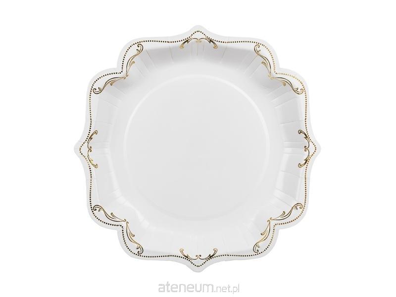 Talerzyki papierowe dekoracyjne w kolorze białym ze złotym ornamentem, średnica ok. 26 cm.(1 op. / 6 szt.)