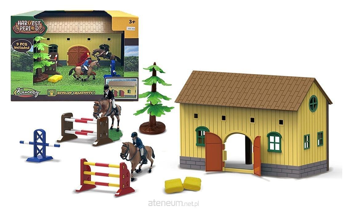W zestawie: stajnia, dwie figurki jeźdźców na koniach, 3 przeszkody do skoków, 2 kostki sianka, drzewo; 3+