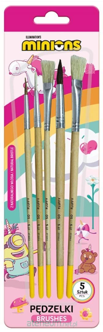 W zestawie 2 płaskie pędzle - rozmiar 12 i 8 oraz 3 okrągłe - rozmiar 4, 6, 10. Na pędzelkach motyw z serii Minionki