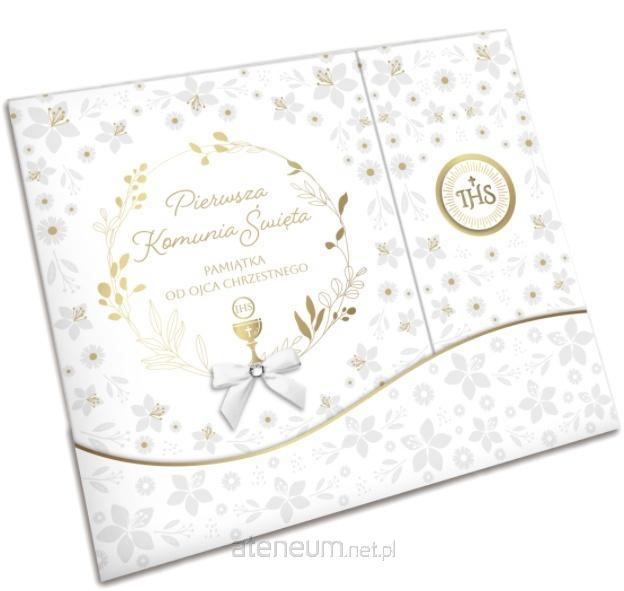 Książeczka z okazji I Komunii Świętej w formacie A4 wraz z kopertą w środku.