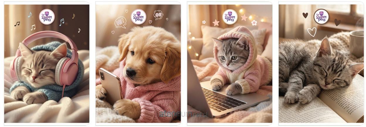 Zeszyt A5 z zadrukiem linia, który idealnie sprawdzi się jako niezbędne narzędzie w szkole.\nZestawienie kompaktowego formatu A5 z liczbą kartek wynoszącą 60 zapewnia odpowiednią przestrzeń do zapisywania notatek, wykonywania szkiców czy rozwiązywania zadań.\nZeszyt wykonany został z wysokiej jakości papieru o gramaturze 70g, co gwarantuje trwałość i wygodę pisania.\n Dodatkowo, środek zeszytu został zadrukowany linią, co ułatwia organizację notatek oraz czytelność zapisanych treści.\nOkładka zeszytu została specjalnie pokryta matowym lakierem UV, który nie tylko nadaje mu elegancki wygląd, ale także chroni przed zabrudzeniami i uszkodzeniami.\n Dodatkowym atutem są zaokrąglone rogi, które zapewniają komfort podczas użytkowania.\nOprawa zeszytu jest miękka, co daje możliwość swobodnego przeglądania kartek oraz składania zeszytu w dowolny sposób. Dzięki temu zeszyt idealnie dopasuje się do każdej potrzeby. idealny do szkolnych notatek i zadań\n praktyczny i wygodny w użytkowaniu\n wzór The Sweet Pets\n format A5, 60 kartek w linię\n grubość kartek 70g\n liniatura niebieska, margines czerwony\n okładka miękka\n uszlachetnienie: lakier UV matowy\n wewnętrzna okładka bez nadruku\n etykieta do wpisania danych na okładce: brak\n trwałe materiały i solidne wykonanie\n zaokrąglone rogi