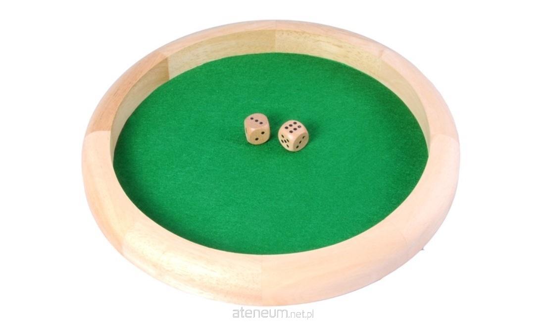 Tacka wykonana z drewna kauczukowego z intarsjowanym zielonym filcem, w zestawie 2 drewniane kostki. Średnica planszy: 29 cm. Wymiary kostek: 18 mm.
