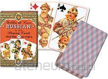 Najwyższej jakości karty do gry renomowanej firmy Ferd. Piatnik & Sohne. Na awersach oryginalne rosyjskie figury, piękne asy i jokery, rewersy symetryczne. Talia składa się z 55 plastikowanych kart o wymiarach 58 x 89 mm i gramaturze 310. Idealna zarówno do brydża, pokera, remika jak i innych gier. Wyroby wiedeńskiej fabryki Ferd. Piatnik & Sohne od 1824 roku urzekają bogactwem wzorów i perfekcją wykonania. Jakość i tradycja!