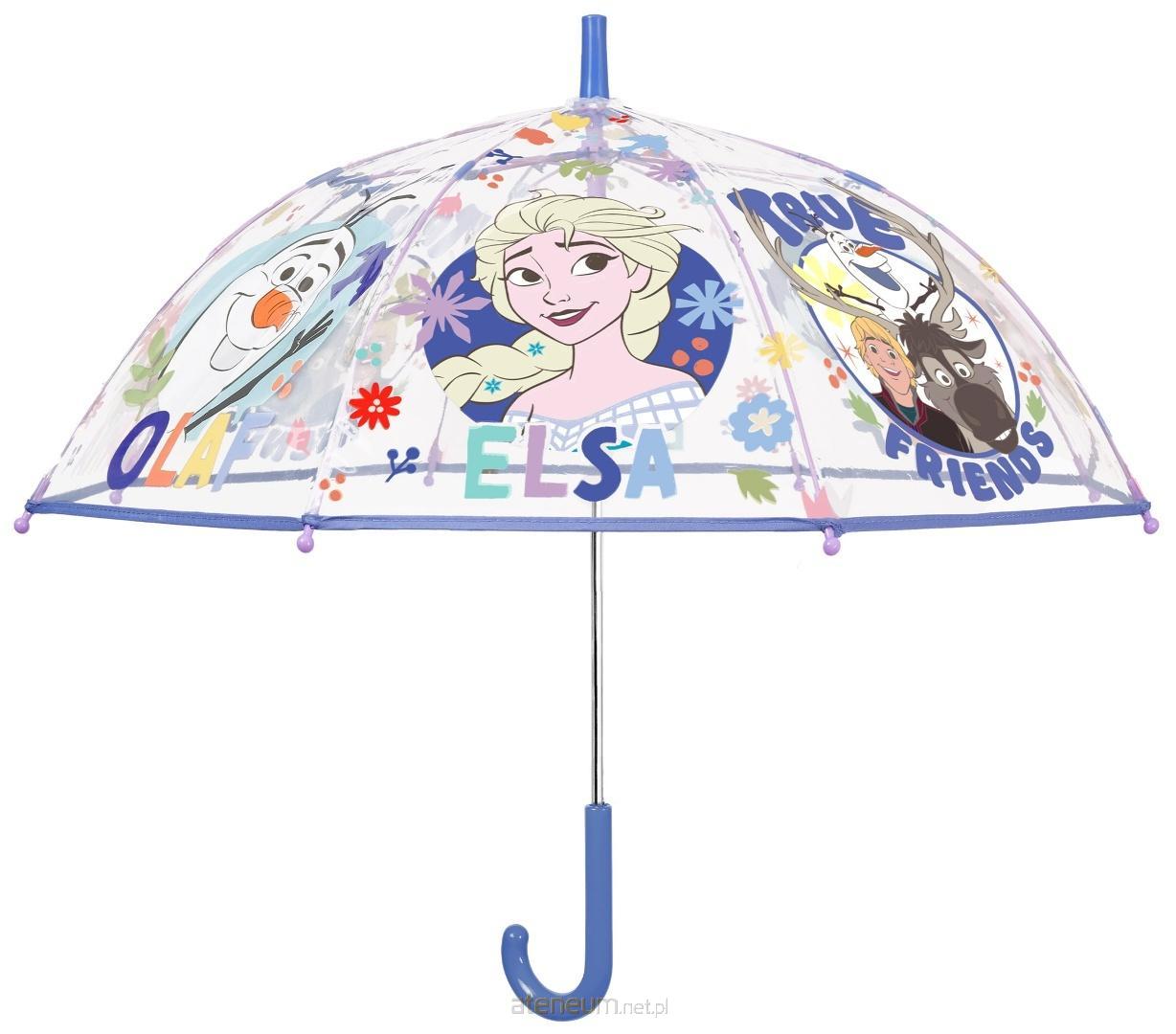 Przezroczysta parasolka dziecięca z licencjonowanym motywem z bajki Frozen to magiczny i praktyczny dodatek na deszczowe dni. Na każdej części czaszy znajdują się starannie wypisane, kolejno bohaterowie bajki, co nadaje parasolce wyjątkowo bajkowy i przyciągający wzrok charakter. Całość uzupełniają niebieskie elementy - rączka oraz końcówki szprych - które tworzą spójny i estetyczny wygląd.