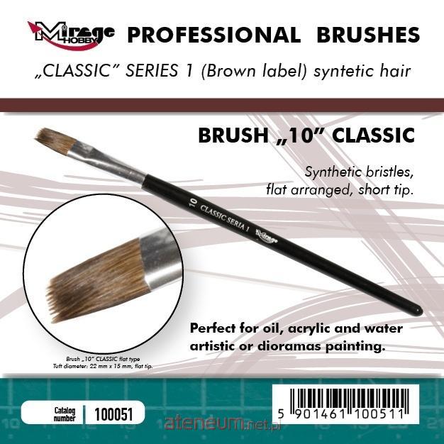 Mirage Hobby Pędzle Płaskie PROFESSIONAL Seria płaskich pędzelków o wysokiej jakości syntetycznym włosiu i krótkim trzonku. Pędzle z serii PROFESSIONAL Seria 1 idealnie nadają się do malowania po różnych powierzchniach, jak i również świetnie poradzą sobie z użyciem w technice \"suchego pędzla\" (DRY BRUSH). Idealne do pracy ze wszelkiego rodzaju farbami akrylowymi, olejnymi, wodnymi etc