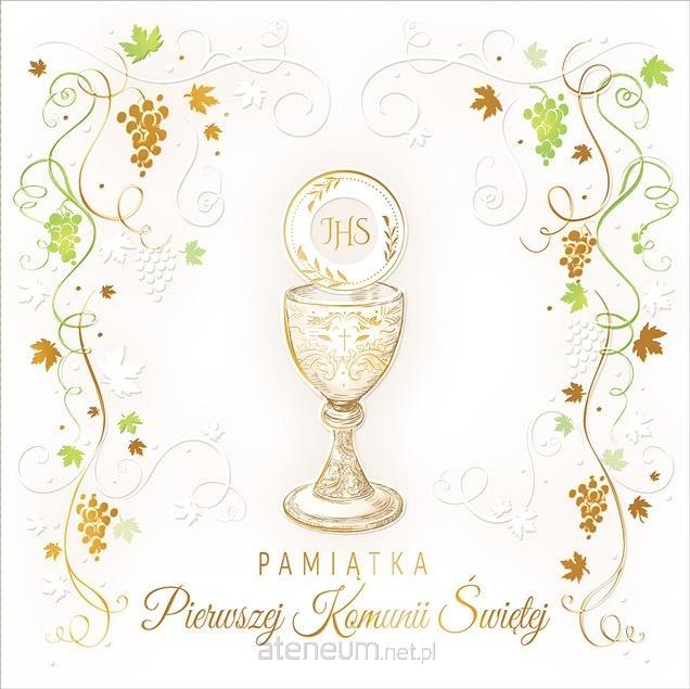 Karnet komunijny, złocony i tłoczony, tekst życzeń w środku.
