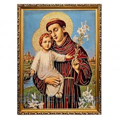 Piękne, bogate kolory oraz dostojne złote nici nadają wizerunkowi wyjątkowego blasku i podniosłości. Haftowana technika tworzy unikalną fakturę i głębię, sprawiając, że obraz jest nie tylko przedmiotem kultu, ale także artystycznym dziełem. Całość oprawiona jest w elegancką, zdobioną złotą ramę o szerokości około 3 cm, która doskonale podkreśla sakralny charakter dzieła.