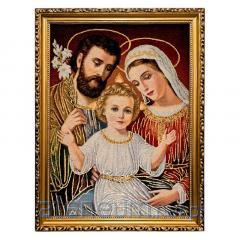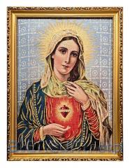 Kunsztowny haft wykonany przy użyciu bogatej palety barw oraz lśniących złotych nici nadaje dziełu unikalną fakturę i niespotykany blask. Złote detale na nimbach, płomieniach i promieniach Serc wspaniale kontrastują z barwami szat, tworząc wizerunek pełen sakralnego majestatu. Całość została oprawiona w szeroką, bogato zdobioną złotą ramę o szerokości około 3 cm, która doskonale podkreśla prestiżowy charakter i artystyczną wartość obrazu.