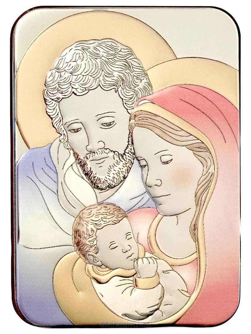Wizerunek Świętej Rodziny jest przedstawiony w delikatnych kolorach, które harmonijnie łączą się ze srebrnym tłem, nadając scenie głębi i subtelności. Obrazek jest wykonany ze srebra, a jego powierzchnia została częściowo kolorowana, co pięknie podkreśla detale i dodaje mu wyrazistości. Srebrny, kolorowany wizerunek jest umieszczony na solidnej, drewnianej podstawie, co dodaje mu naturalnego uroku i stabilności. Do obrazka dołączona jest również praktyczna podstawka, dzięki której jest on od razu gotowy do postawienia.