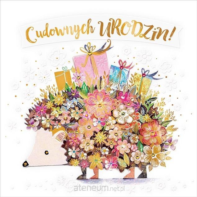 Karnet urodzinowy, złocony i tłoczony, tekst życzeń w środku.