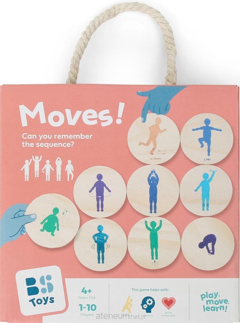 Naśladuj Ruch - Moves to aktywna gra zręcznościowa, w której liczy się pamięć, ruch i dobra zabawa. Każdy drewniany żeton przedstawia zabawny ruch, który trzeba wykonać - na przykład skok, gest lub pozycję ciała. Zadaniem graczy jest zapamiętać całą sekwencję ruchów i powtarzać ją w odpowiedniej kolejności, dokładając w każdej rundzie nowy ruch.