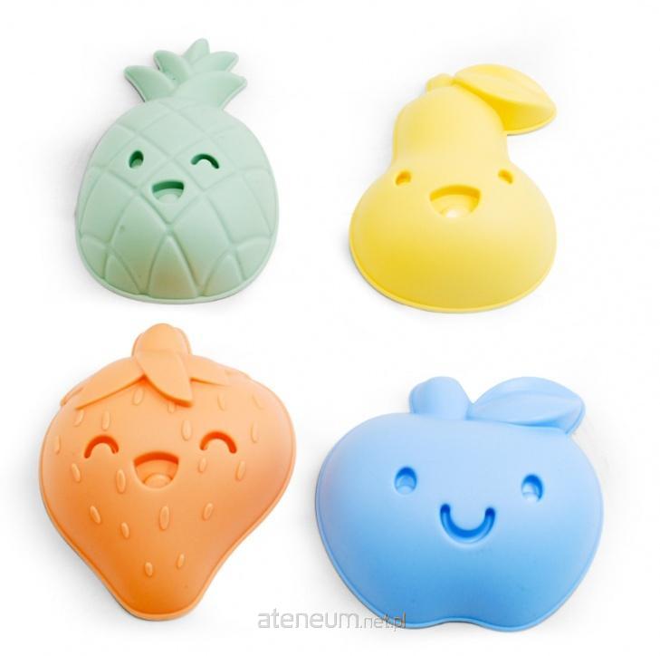 Zestaw 4 foremek w kształcie owoców: jabłko, gruszka, truskawka i ananas.