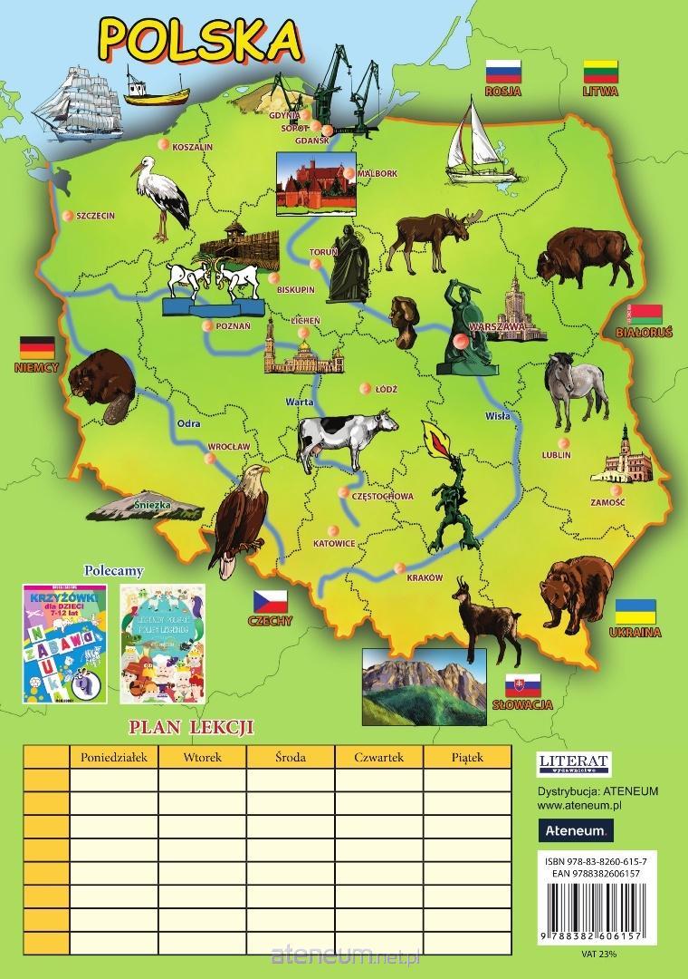 Niezbędnik ucznia - z jednej strony tabliczka mnożenia, z drugiej plan lekcji i mapa Polski. Poręczny format A5.