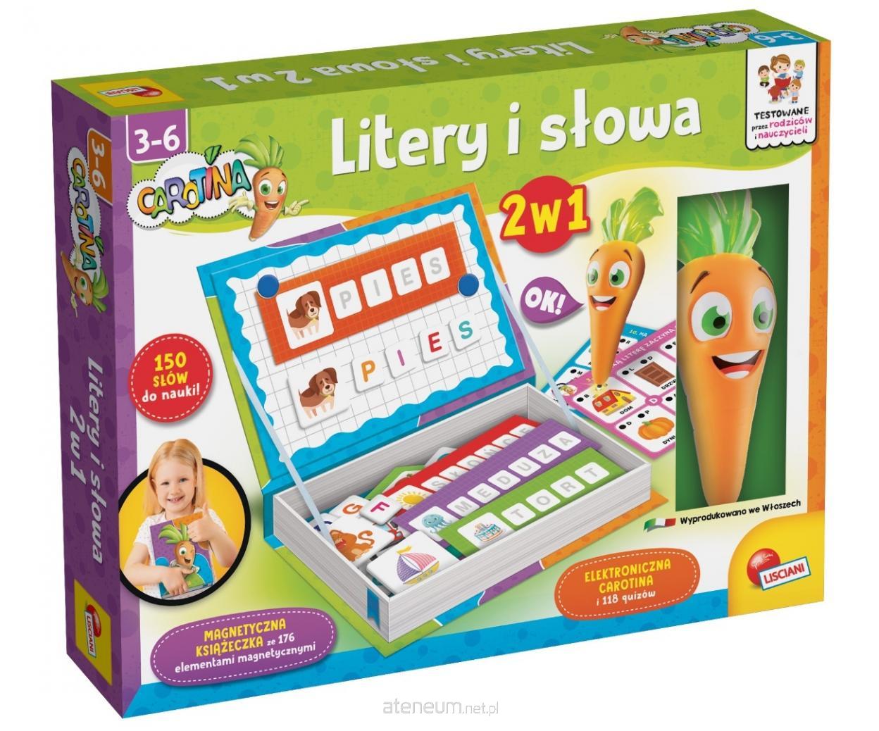 Wyjątkowe połączenie dwóch wspaniałych klasyków edukacyjnych! Pudełko z magnetycznym zestawem do gry i elektroniczną Carotiną. Wiele aktywności pomagających odkrywać litery oraz słowa!