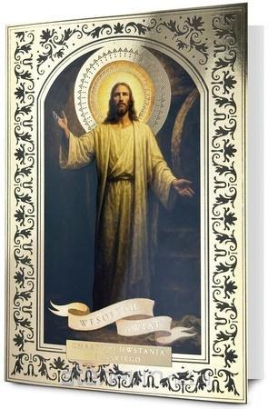 Kartka jest zdobiona złotą folią, zawiera życzenia oraz kolorowy środek. W zestawie znajduje się koperta, kolorystycznie uzupełniająca się z kartką