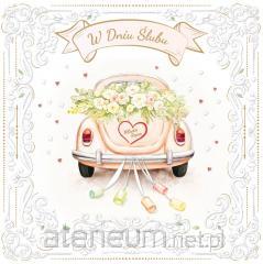 Karnet ślubny z kopertą, złocony i tłoczony, tekst życzeń w środku.
