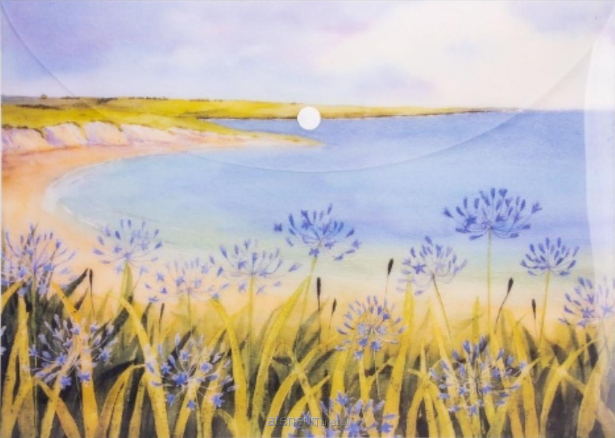 Ozdobna teczka kopertowa VISTA, wykonana z trwałego polipropylenu z nadrukiem przedstawiającym morski pejzaż z niebieskimi kwiatami na pierwszym planie. Zamykana na zatrzask typu napa. Dzięki pełnemu zadrukowi, zawartość teczki pozostaje niewidoczna na zewnątrz. Idealne rozwiązanie do przechowywania dokumentów lub niewielkich płaskich przedmiotów.