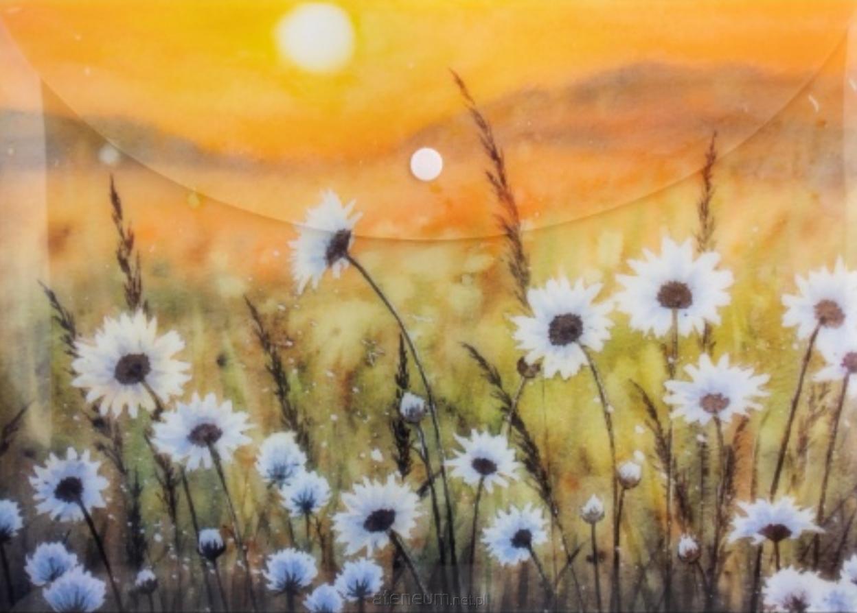 Ozdobna teczka kopertowa VISTA, wykonana z trwałego polipropylenu z nadrukiem przedstawiającym dzikie kwiaty o zachodzie słońca. Zamykana na zatrzask typu napa. Dzięki pełnemu zadrukowi, zawartość teczki pozostaje niewidoczna na zewnątrz. Idealne rozwiązanie do przechowywania dokumentów lub niewielkich płaskich przedmiotów.