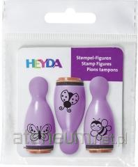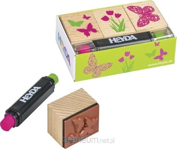 Zestaw 3 drewnianych stempli, każdy z innym motywem. Do zestawu dołączony jest sztyft z dwiema nasączonymi tuszem poduszkami, w kolorze zielonym i różowym.
