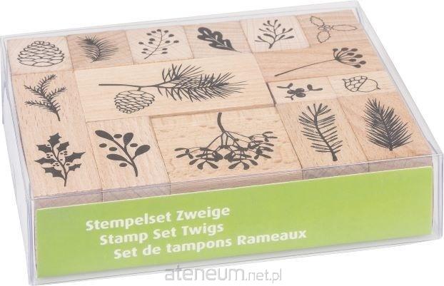 Zestaw 15 drewnianych stempli, każdy z innym motywem.