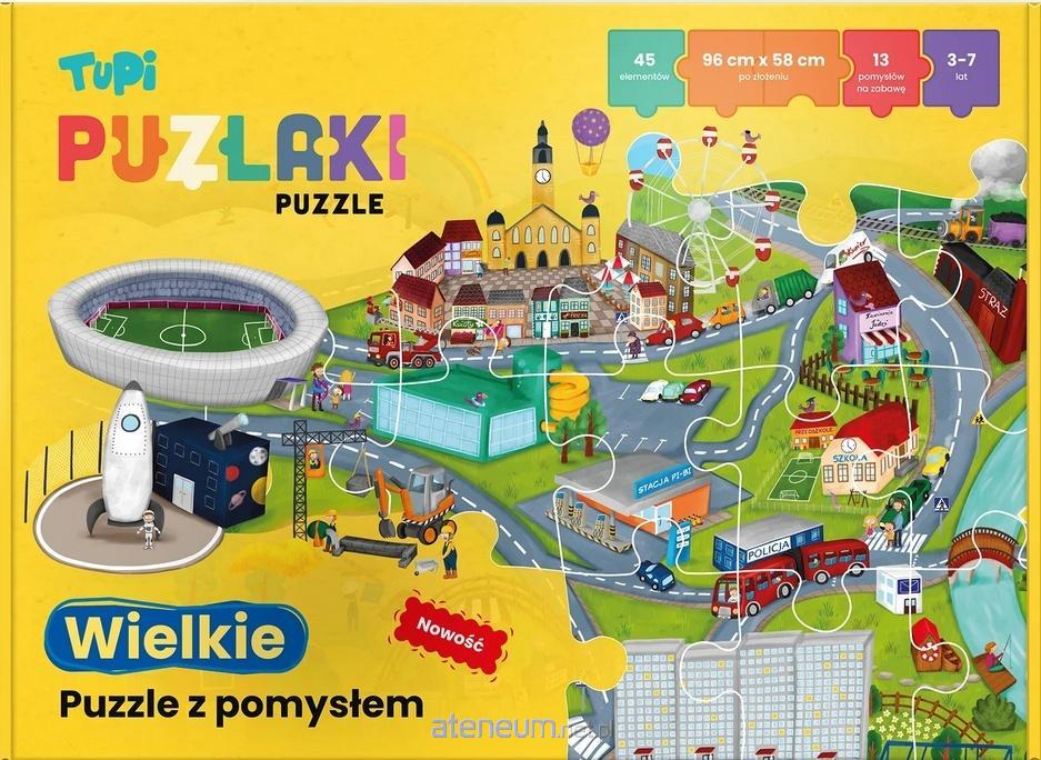 Kraina Relacji PUZLAKI Wielkie Puzzle dla dzieci - duże puzzle z pomysłem | To nie są zwykłe puzzle prawdziwa zabawa zaczyna się po ich ułożeniu, dzięki dodatkowym scenariuszom aktywności | Bardzo duża układanka: 96 x58 cm po złożeniu | 45 dużych elementów z grubej tektury | 13 dodatkowych scenariuszy zabaw | Autorska ilustracja pełna szczegółów | Optymalna trudność zapewniająca dłuższą i angażującą zabawę | Wspiera spostrzegawczość i uczy cierpliwości | Trening dla mózgu i rąk | Pomysł na rozwijający prezent do wspólnej zabawy także dla dorosłych | Rozwija: logiczne myślenie, koncentrację, odkrywanie powiązań, odpoczynek od bodźców, budowanie bliskości, spostrzegawczość | Układanie puzzli to świetny sposób na spokojną i wartościową zabawę, która angażuje i wycisza | Opinia ekspertki: Układanie puzzli stymuluje rozwój mózgu, wspiera pamięć wzrokową, koncentrację i rozwiązywanie problemów oraz rozwija motorykę małą. To wartościowa aktywność dla dzieci i wsparcie dla rodziców oraz specjalistów.
